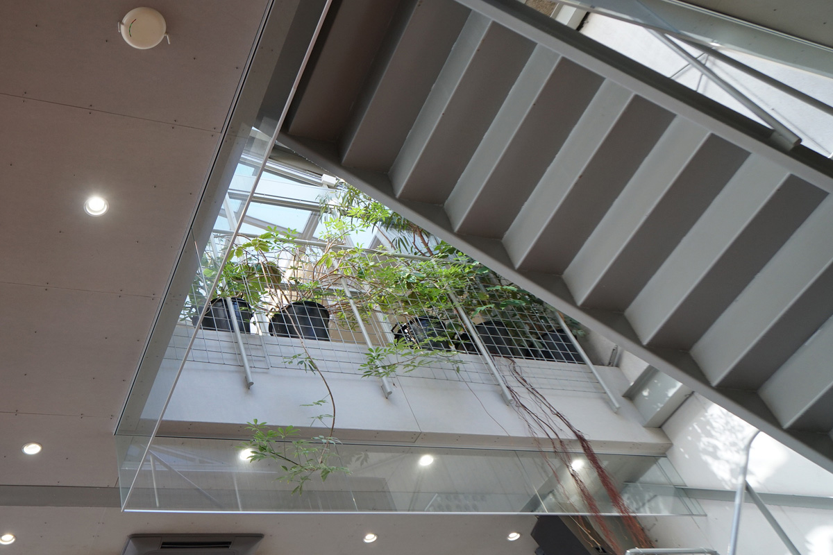 階段周りの吹抜けからトップライトの光が注ぎ、2階の樹木を垣間見えることが出来る。/撮影:桐原武志 2025年