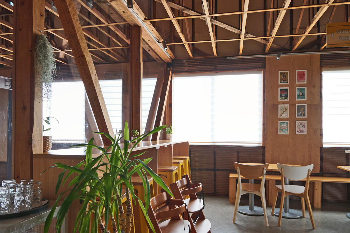 2Fカフェ内観:左側の開口よりスタジオ内を見ることが出来る/