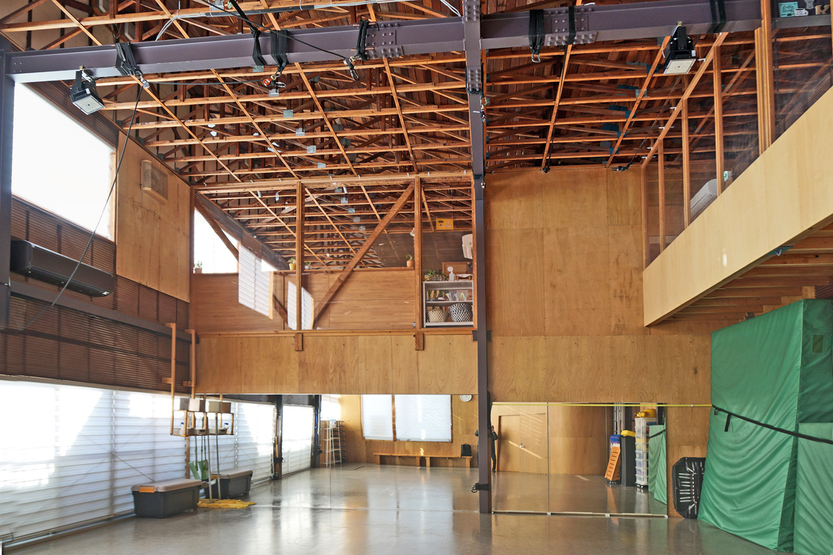 スタジオ内観。小豆色が新たに加えられた鉄骨。天井材が剥がされ繊細な小屋組みが見える。/撮影:桐原武志 2025年