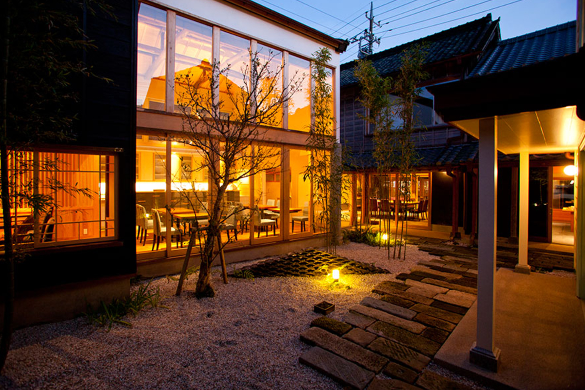 中庭部分に架かっていた大屋根を取り外した後には、さまざまな建築様式の建物が脈略なく建っている不思議な棟配置が現れた。そこで、むしろ、その重なり合った時間の不整合な感じや、遺構のイメージを大切にしながら空間全体を再構築していった。震災で落下した古瓦のオブジェや土蔵の基礎石でつくった石畳、もともとあった板金製の古い鬼瓦や錆びたトタン波板、廃墟感をあえて残す裏庭など、「いなえ」のあちこちに場所の記憶をちりばめ、歴史を感じる風景をつくった。<郡裕美+遠藤敏也>
