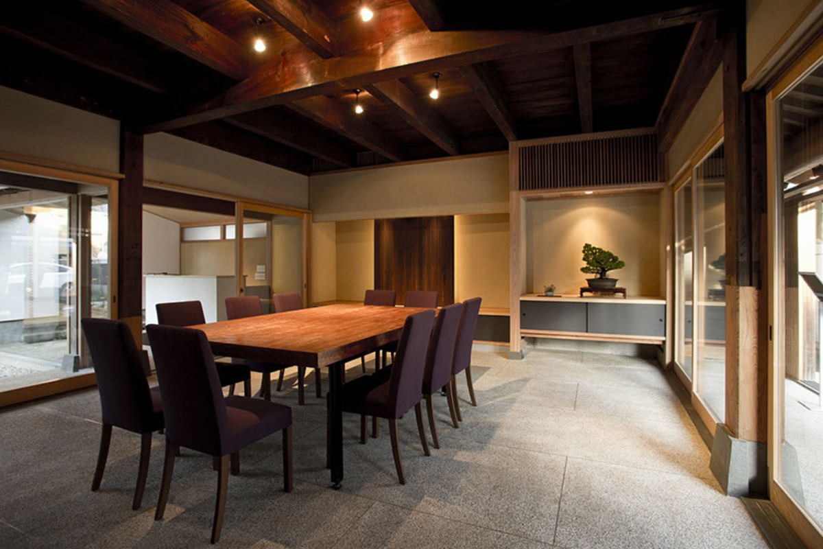 今回の計画は、そこに堆積した歴史を少しづつ紐解くことから始まった。古写真が残っていた町家の外観以外は原型がほとんどわからず、柱のほぞから架構を推察したり、近隣にある他の類似建物に手がかりをもとめるなど、考古学的な取り組みで設計を進めた。また、各棟とも老朽化がかなり進んでおり、基礎、構造、屋根、内外装すべてに手を入れる必要があった。