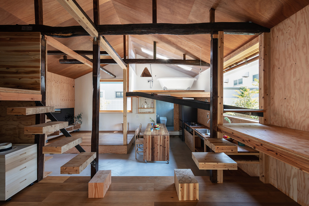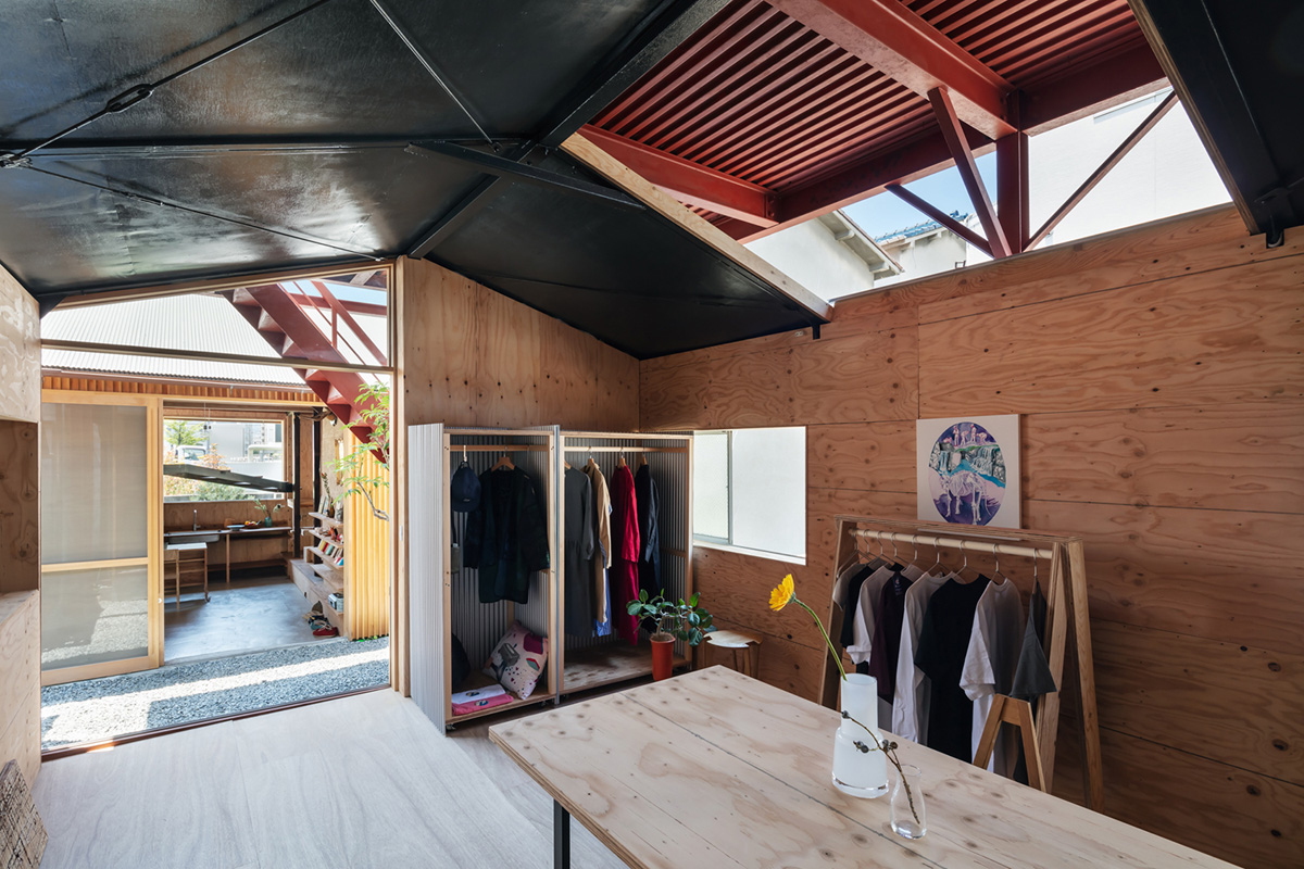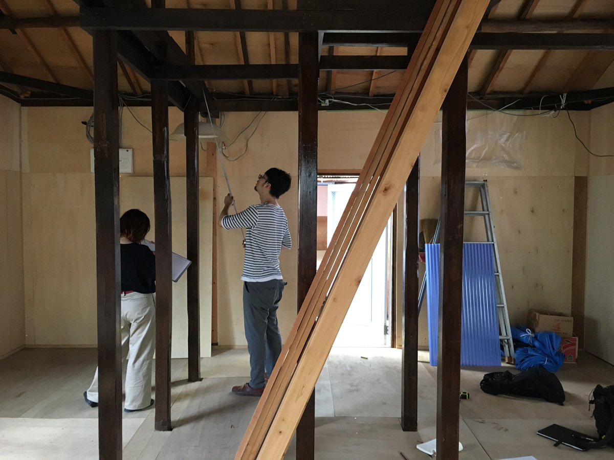 | リノベーション概要 | 人の家のお風呂に富士山を描く画家から、3棟の倉庫物件を見に来てほしいと言われた。周辺は道路に面した敷地からマンション等へ更新が進んでいたが、今回の敷地は路地のみで再建築不可の条件であった。隣近所も接道していない木造家屋は取り残されたように高齢者が住み続けていたが、路地を介してご近所付き合いもほどよく残っていた。既存建物は1975年築で幾度も改修され、増築も減築も繰り返していた。素人が関与したと思われる箇所も多く構造的にも不安定であった。改修予算が限られていたこともあり、住人と仲間たちで1年強をかけ日曜大工で修理した。2020年春に着工すると、風の心地よさを体感し、窓を引き込み窓に取り替え四方八方から風が流れ込むようにした。夏は屋根下の猛暑に断熱材の充填を急ぎ、秋は外壁を下地材の胴縁の重ね合わせで仮の仕上げとした。冬には住める設えになっていたが、残工事も多く、まだ住み始めることはなく2回目の春を迎えた。小さな修繕が周辺を巻き込み、生きられる場所へと紡いでいく。街全体を家と考えると暮らしは豊かに感じられる。現場である環境に身を置き修理したことは、既存へ働きかけ価値を発見し、次の時代へ継承していく野蛮で原始的なフロンティアがそこに広がっていることを確信させた。 |