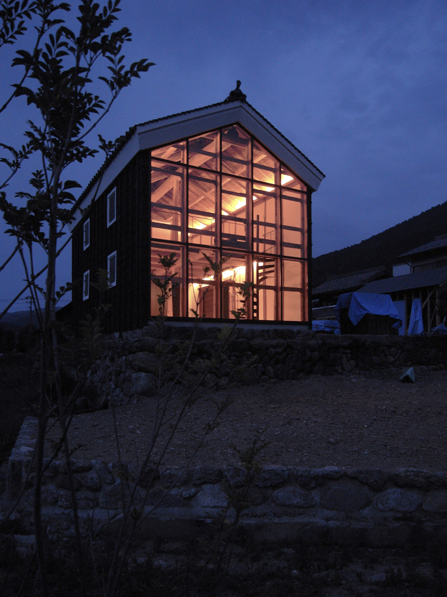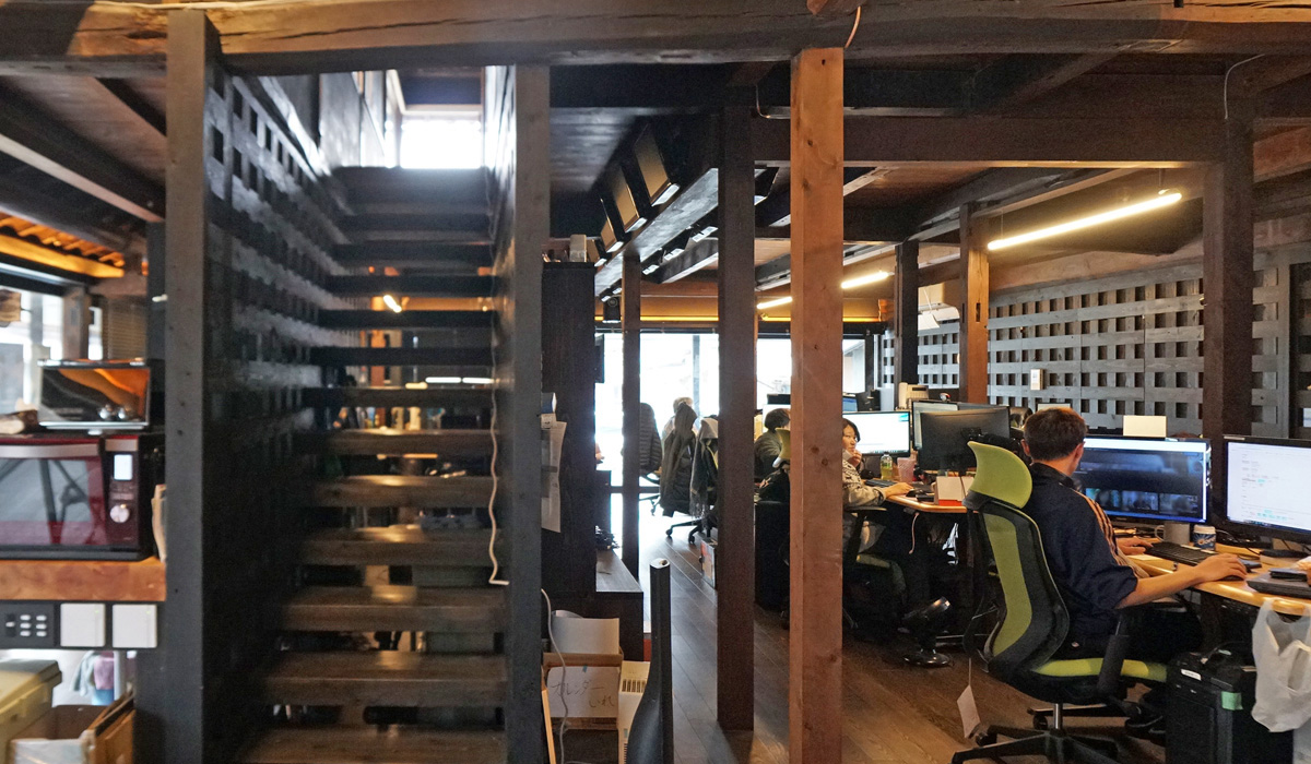 | リノベーション概要 | 徳島県の山間部神山町に建つ築80年ほどの民家および蔵を企業のサテライトオフィスへと改修.「オープン&シームレス」を理念に掲げる企業の働き方を具現化するため,外壁はガラス張りとし,外周に奥行約2.8mの縁側空間を新設.外部とのバッファーとすると共に地域の人が気軽に立ち寄れる、地域に開かれたオフィスとなっている。敷地内に建つ蔵の、隣家の火事で焼失した妻面をガラスのカーテンウォールとし新旧を対比させた外観となっている。 市町村が抱える人口減、空家対策、高度成長時代が終わりコロナ禍が引き金になった働き方・ライフスタイルの変化に対応する手法として建築リノベーションの可能性の実践事例を「えんがわオフィス」に見ることが出来る。 敷地内に建てられたサーバールームの2階はテープ、ハードディスク、サーバーを収容した倉庫となっており、サーバーの排熱対策には自然外気をを活用した温度管理を行っている |