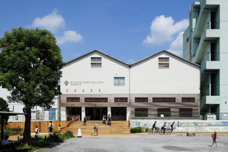 [No220] 切妻屋根が連結した建物をカフェとギャラリーにリノベーション。通常は河川側に出入口を設けるのは困難だが、親水公園施設の一環とすることで解決。