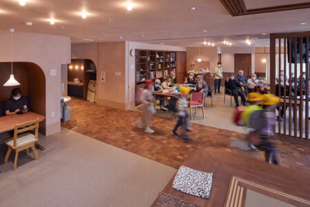 [No225] 高齢者デイサービス、学童保育クラブ、子育てひろばの3つからなる複合型福祉施設。建物を貫通する通路”えんみち”を学童保育クラブに向かう学童と”えんみち”に面したデイサービスの高齢者との触れ合いが日常的に生まれている。